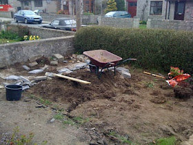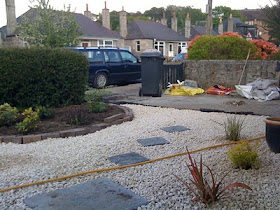 The front garden has had its long awaited make-over last year. Concrete slabs, tired tarmac and a tiny bit of lawn have been replaced by a new path, gravel, plant beds and evergreen shrubs. Low maintenance, we hope... These are photos of the work-in-progress, plus two at the bottom of what it looks like one year later... can't believe how quickly plants grow!