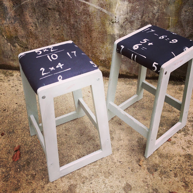| Breakfast bar stools I have upcycled and painted for customers in Annie Sloan mixed white and duck egg blue chalk paint and recovered in fabric by Prestigious |