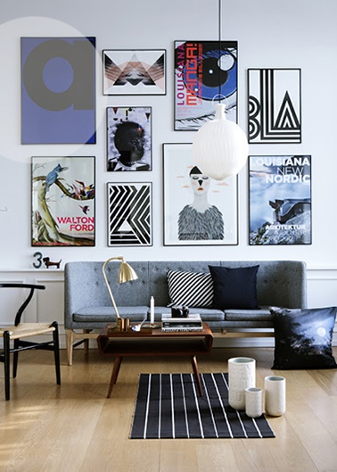 | Great collection of artwork above a wonderful grey wool sofa http://pinterest.com/pin/259027416040438341/ |