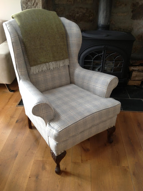A few weeks later and this is the result. I choose a charcoal deep grey velvet for the inside and a grey and mustard yellow printed 'stamp' fabric for the outside of the chair. Debra selected a 100% wool tartan material to cover the whole of her chair. Initially meant to sell them on to our customers, we both love the chairs so much that we are just going to keep them all to ourselves! (*but do let us know if you want your own chair revamped like this!)