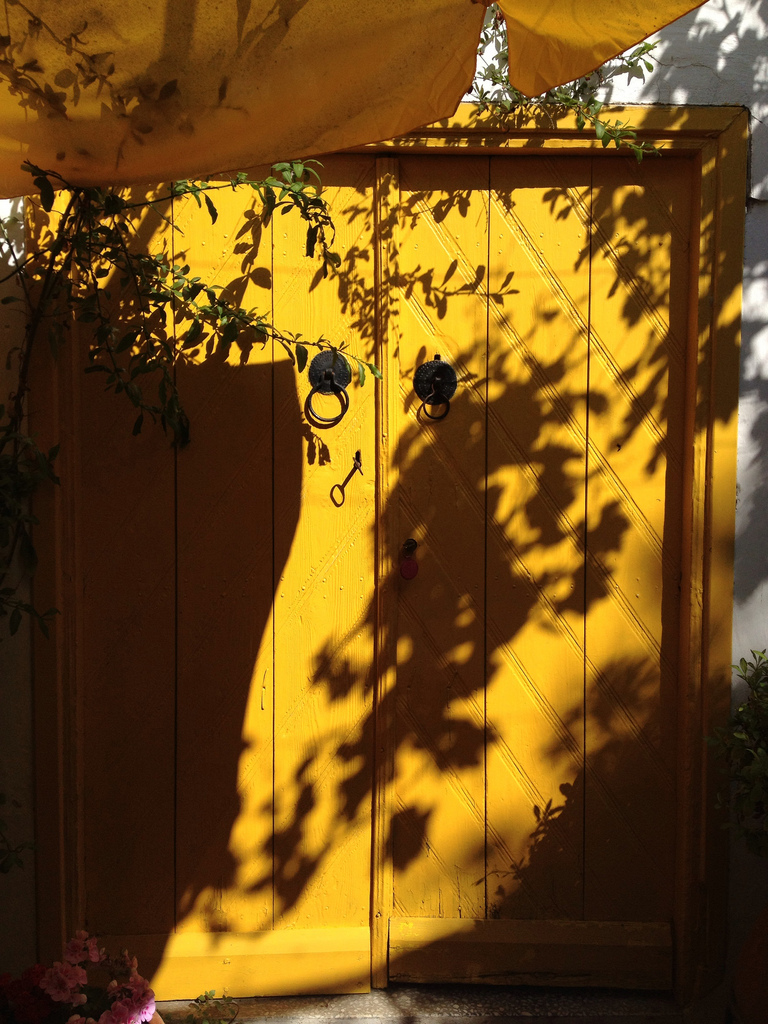 | Sunlight and shadows on a beautiful yellow door in Bellapais, North Cyprus |